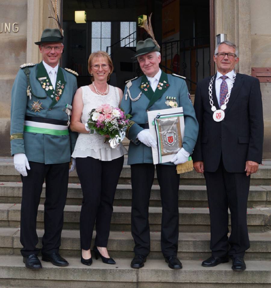 Eine besondere Auszeichnung konnte tags zuvor bereits der Ehrenhauptmann der Westkompanie, Magnus Wille, entgegen nehmen. Beim traditionellen Empfang der Majestäten im Rathaus verlieh ihm der stellvertretende Bürgermeister Martin Schulte das Ehrenschild der Stadt Bad Lippspringe.