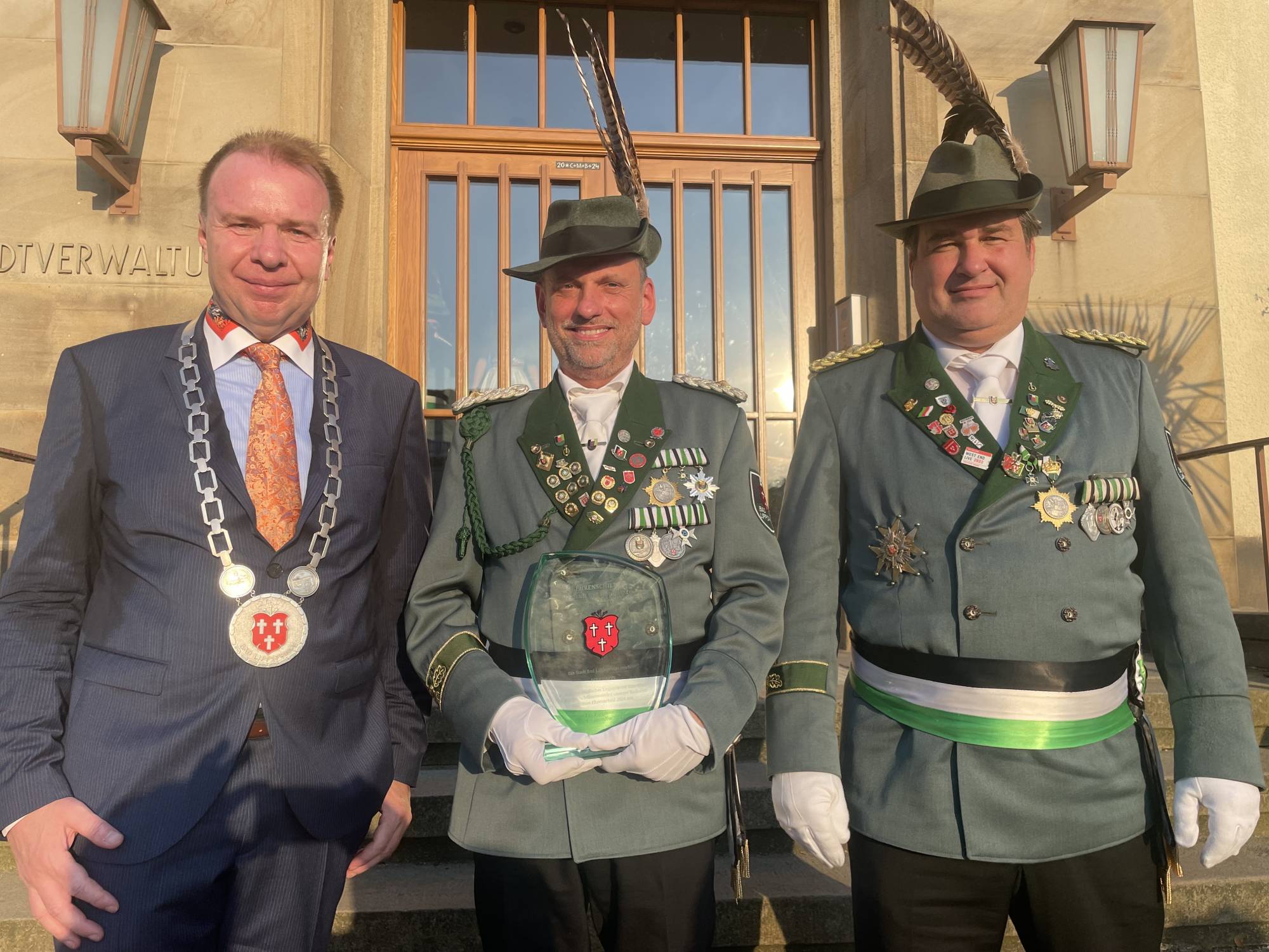 Bad Lippspringe - Mit dem Ehrenschild des Bürgerschützenvereins wurde am Abend Oberstleutnant Dirk Lappe ausgezeichnet. Seine ehrenamtliche Tätigkeit für und im Bürgerschützenverein sei bemerkenswert, stellte Lange in einer kurzweiligen Laudatio fest.
